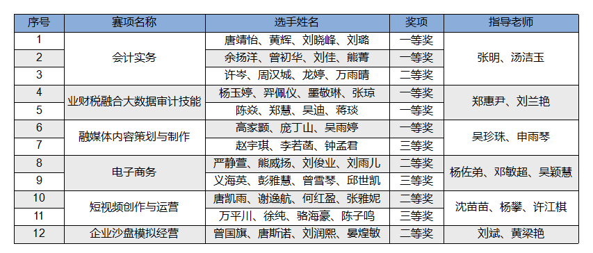 此次竞赛,经济管理学院共参加了会计实务、业财税融合大数据审计技能、数智沙盘模拟经营、电子商务、直播电商、融媒体内容策划与制作、短视频创作与运营7个赛项的竞赛,共派出参赛队伍14支,参赛选手达46人,指导老师共16人。其中会计实务赛项在张明、汤洁玉两位指导老师的带领下,取得了一等奖第2名、第5名和二等奖第1名的优异成绩;业财税融合大数据审计技能赛项由郑惠尹、刘兰艳老师指导,斩获一等奖2项;在融媒体内容策划与制作赛项中吴珍珠、申雨琴老师指导学生获一等奖1项,三等奖1项。