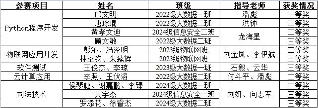 本次竞赛中,信息安全技术学院参赛团队凭借扎实的专业技能和出色的临场表现,“Python程序开发”荣获一、二、三等奖,“云计算应用”荣获二等奖第1名,“物联网应用开发”荣获二、三等奖,“司法技术”荣获二、三等奖,“软件测试”荣获三等奖。从课堂到赛场,从理论到实践,2024级新生在技能赛事中斩获佳绩,多个赛项实现该赛事最高奖项“零的突破”,正是学院构建“阶梯式”技能培养体系成效的最佳注脚。