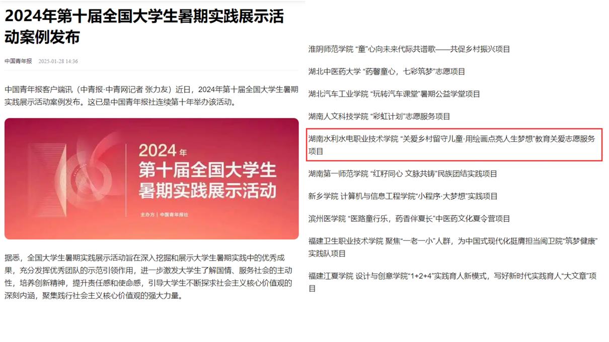 近日,由共青团中央指导、中国青年报主办的“2024年第十届全国大学生暑期实践展示活动”评选结果揭晓。我校经济管理学院发起的“关爱乡村留守儿童·用绘画点亮人生梦想”教育关爱志愿服务项目,从全国众多案例中脱颖而出,成功入选“全国百强成果案例”,成为实践育人领域的标杆示范。
