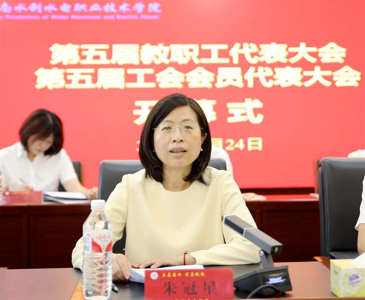 朱冠星代表湖南省教育工会对大会的召开表示热烈祝贺,充分肯定了学校发展和工会工作成效,要求学校工会工作要架好连心桥,加强思想政治引领,引导广大教职工坚定不移听党话、跟党走;要搭建大舞台,助力教师队伍建设,团结动员教职工在学校发展新征程中发挥主力军作用;要当好娘家人,切实履行维权服务职责,提升教职工幸福感、获得感、安全感。