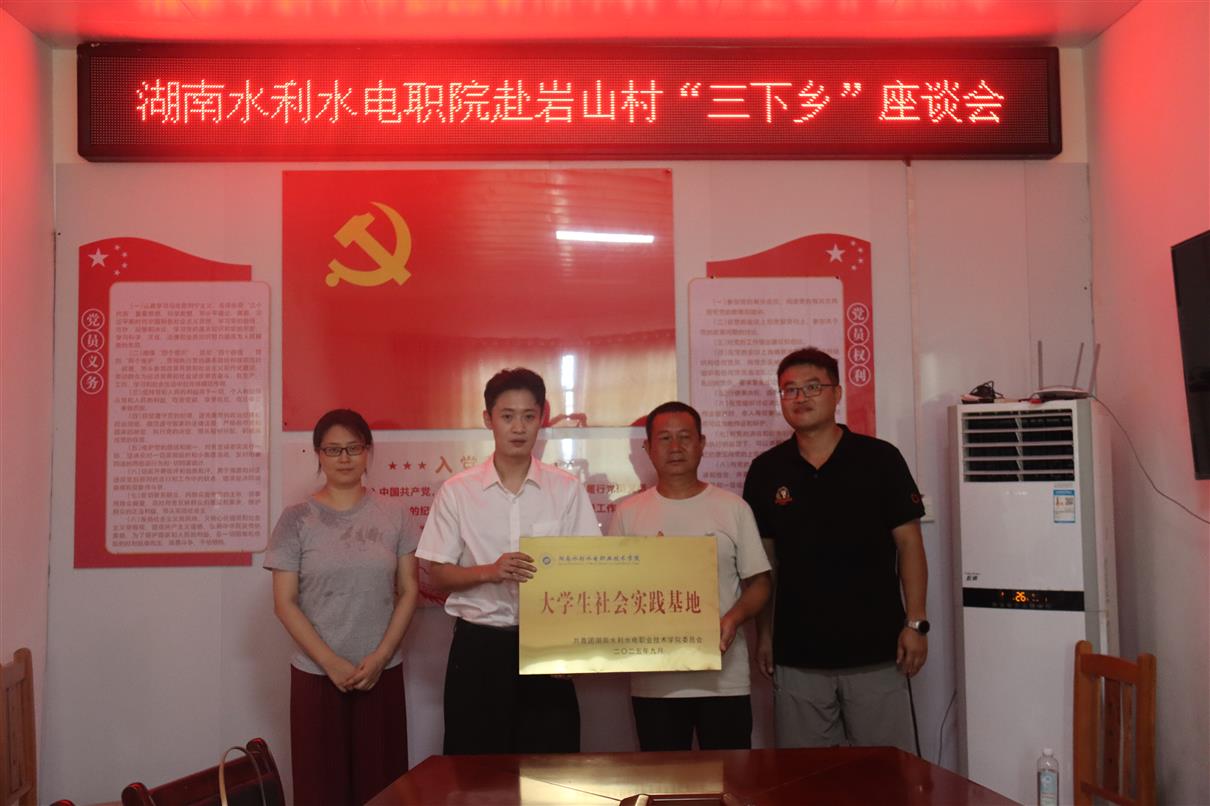 当日午后,“三下乡”专项座谈会暨“大学生社会实践基地”授牌仪式在岩山村村委会举行。岩山村村支书周小亮代表全村群众对师生团队表示欢迎,他用质朴的语言介绍了村庄的水利设施现状、产业发展瓶颈及村民实际需求,字里行间流露着对乡村振兴的迫切期盼。