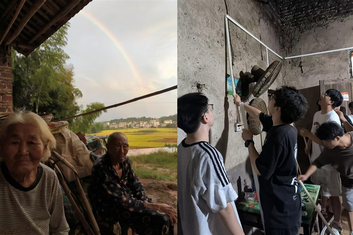 会后,各团队迅速民生慰问、技术支援、安全服务等方向开展志愿服务。“电系万家”实践服务团冒着暴雨直奔两户贫困户家中,着手开展老化线路改造。堂屋内,师生们埋头默契精准开槽布线;廊檐下,两位耄耋老人坐在廊下翘首期盼;天际间,一道彩虹悄然悬垂绽放光彩。山风裹着泥土香,彩虹映着青春色,首日实践已让“水利为民、电力暖乡”的种子在岩山落地——这场双向奔赴的实践,正以专业之力,绘就乡村振兴的生动图景。