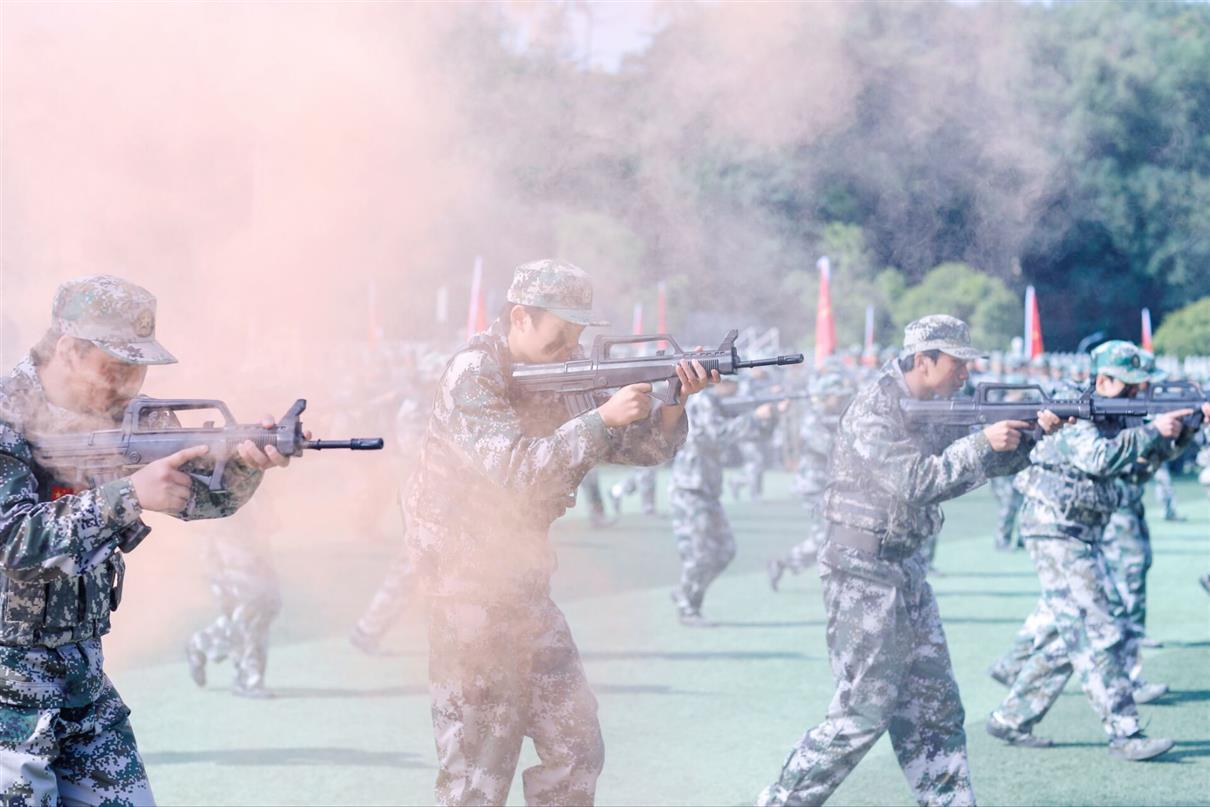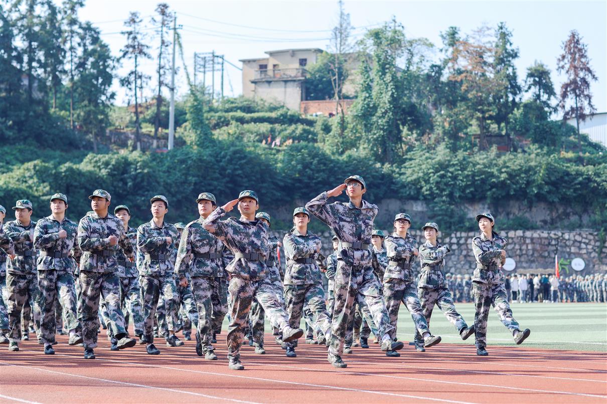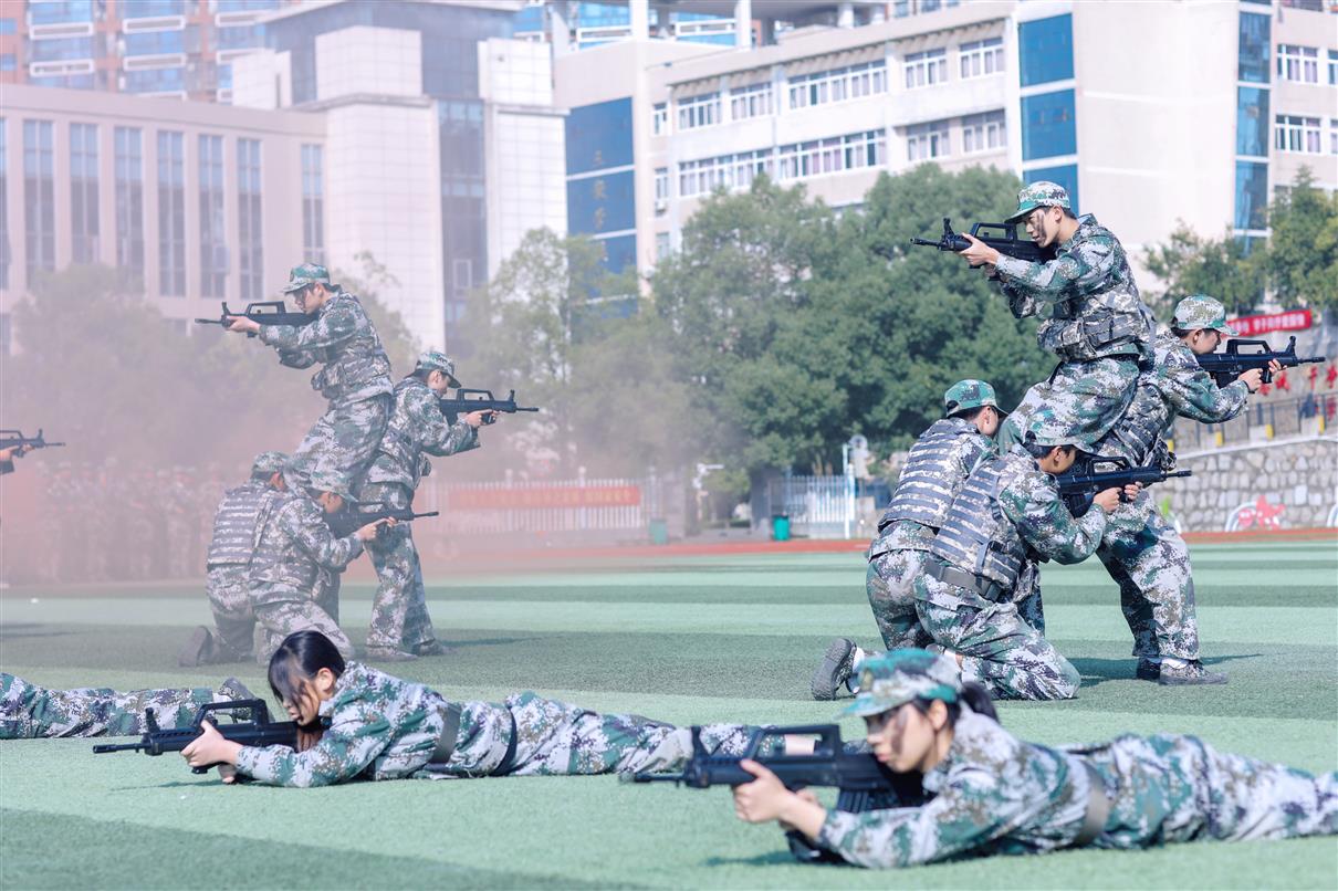 上午9时,大会在庄严的国歌声中正式开幕,全体师生肃立行礼,注视着五星红旗冉冉升起。随后的军训成果汇报环节亮点纷呈、气势如虹。2025级新生以挺拔的军姿、铿锵的步伐、嘹亮的口号,依次进行了分列式、队列表演、擒敌拳、战场救护、持枪战术等科目展示。他们动作刚健、斗志昂扬,如江河奔涌,展现出新时代青年淬火成钢的昂扬风貌,赢得了现场持续而热烈的掌声。