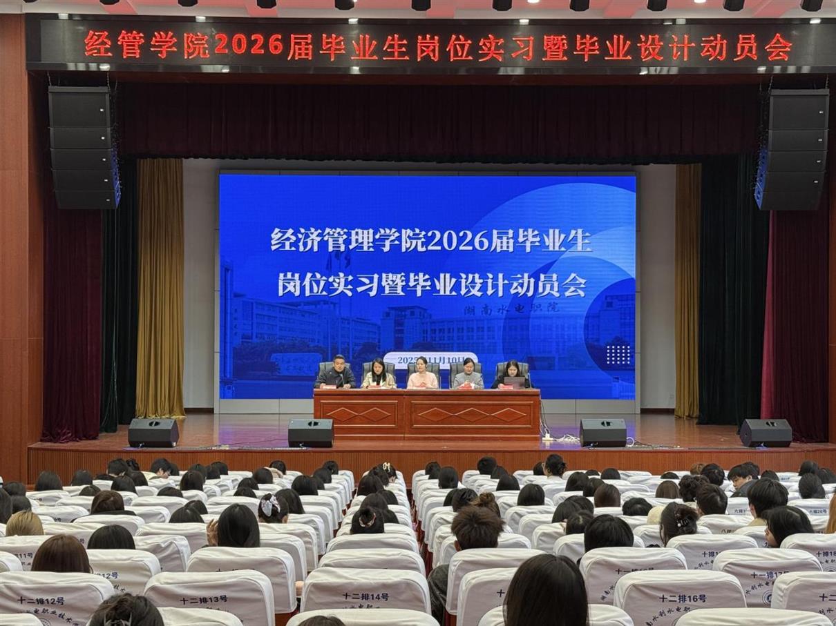 近日,经济管理学院在学校礼堂召开了2026届毕业生岗位实习暨毕业设计动员会,学院领导班子、实训中心负责人、全体指导老师及2026届全体毕业生参会。会议围绕实习政策解读、工作部署、纪律安全及总结动员展开,旨在高质量推进毕业生实践教学环节。