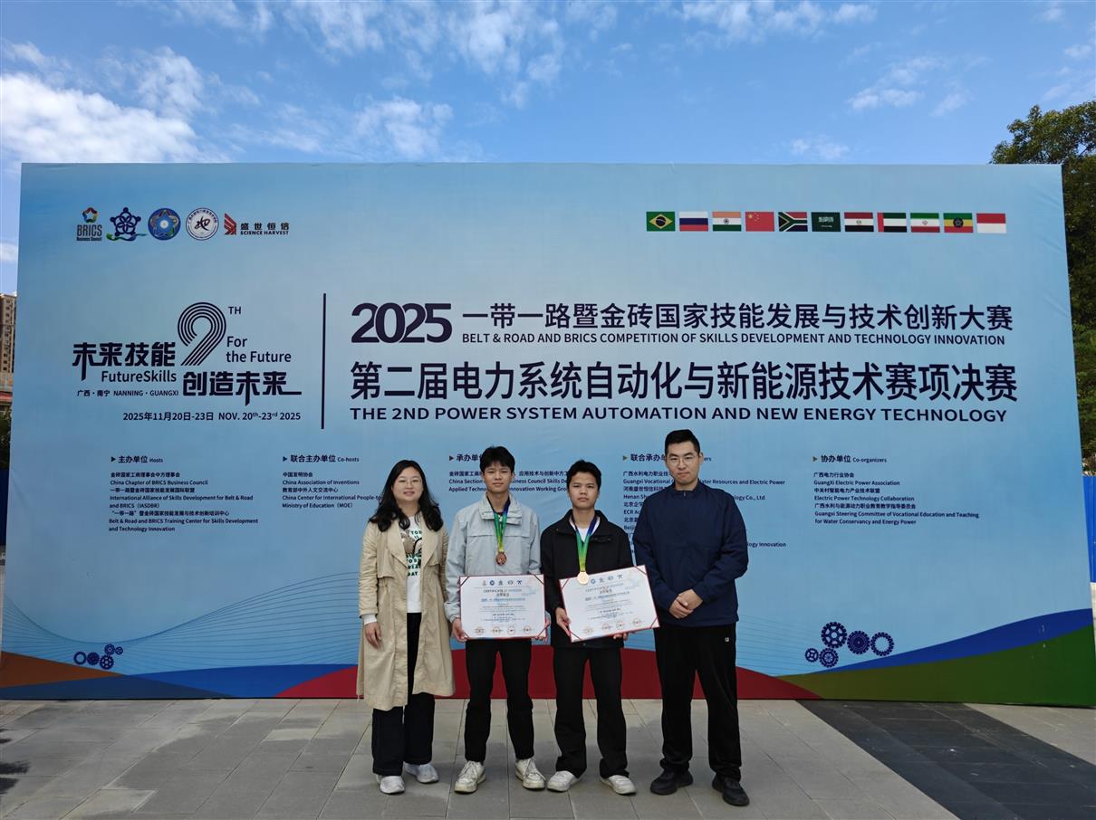 11月23日,2025一带一路暨金砖国家技能发展与技术创新大赛之第二届电力系统自动化与新能源技术赛项决赛在广西水利电力职业技术学院圆满落幕。本次大赛由金砖国家技能发展与技术创新大赛组委会,一带一路暨金砖国家技能发展国际联盟主办,吸引了全国多所院校的优秀选手同台竞技。我校学子在高职组比赛中表现出色,由肖淑斌、谭崇茁两位老师指导的贺通、陈临锋两位选手凭借扎实的专业功底和良好的临场发挥,斩获高职组三等奖。
