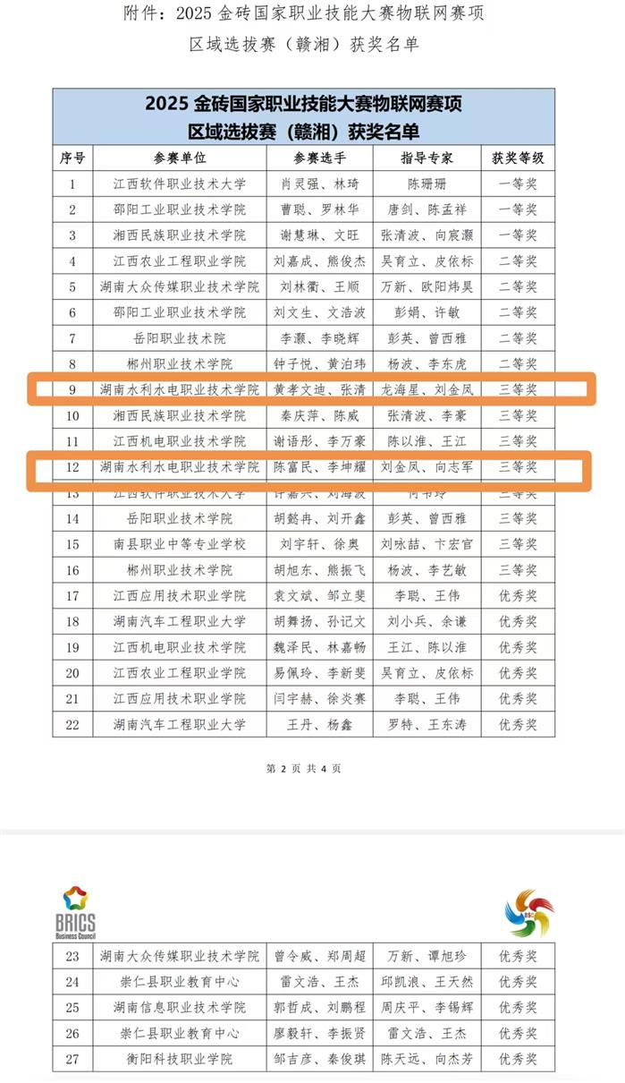 近日,2025金砖国家职业技能大赛(金砖国家未来技能和技术挑战赛)物联网赛项(赛项编号:BRICS-FS-16)区域选拔赛(赣湘)通过线上形式圆满落幕。我校参赛队伍凭借扎实的专业功底、默契的团队协作与出色的临场应变,在赣湘两省多支参赛队伍的激烈角逐中脱颖而出,一举拿下两个三等奖,分别位列总排名第9名、第12名,充分展现了该校在物联网技术领域的教学实力与人才培养成效。
