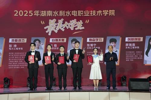 晚会开篇,“最美大学生”颁奖仪式温情启幕。朗诵《水润青春,薪火报国》与情景剧《最美大学生》生动再现了获奖学子的青春风采。廖瑞庭、张博宁、杨宏宇等10名“最美大学生”及10名提名奖获得者依次登台领奖。他们中既有科研攻关的创新能手、技能赛场的拼搏强者,也有扎根服务的志愿先锋、逆境奋进的励志典型,以奋斗诠释“上善若水、求真致远”的校训精神,为全校学子树立了“学有榜样、行有示范”的标杆。