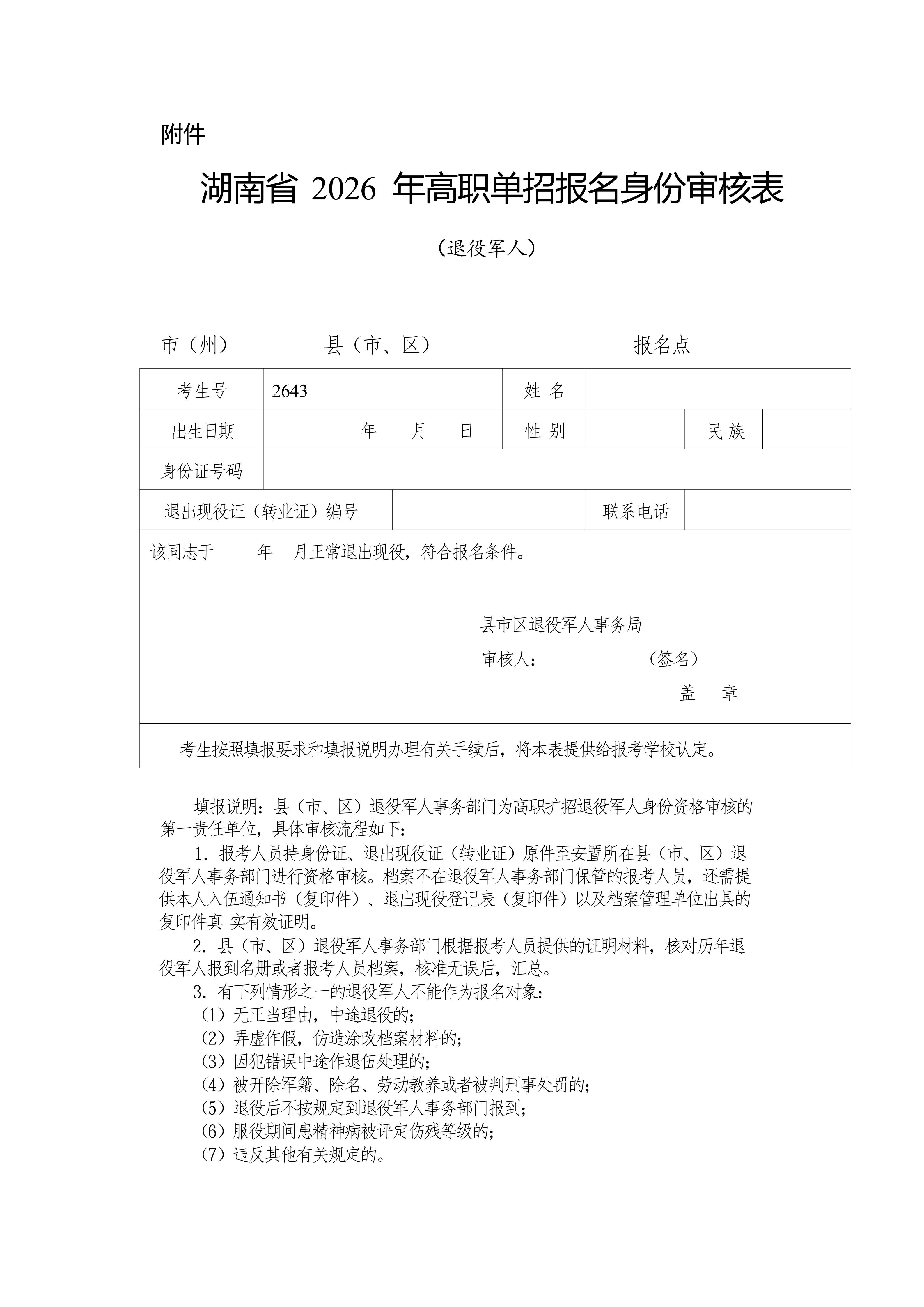 附件:湖南省 2026 年高职单招报名身份审核表(退役军人).docx