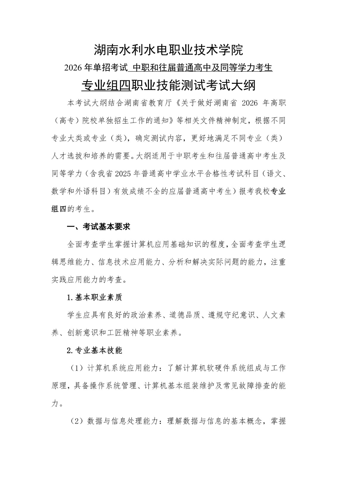 2026年单独招生专业组四职业技能测试大纲
